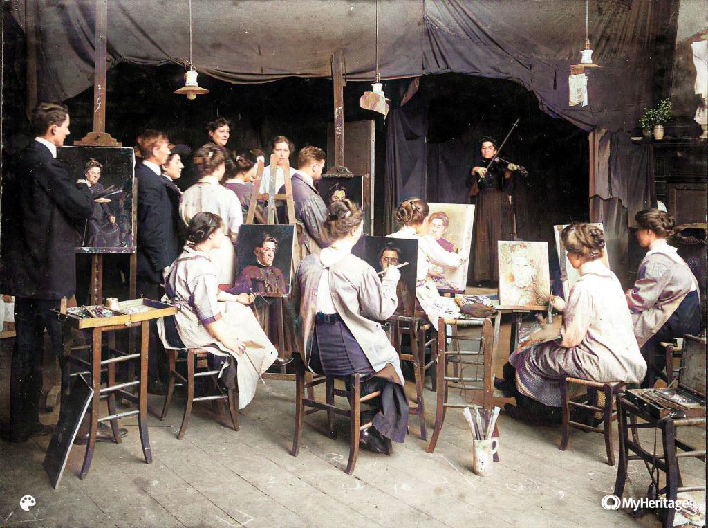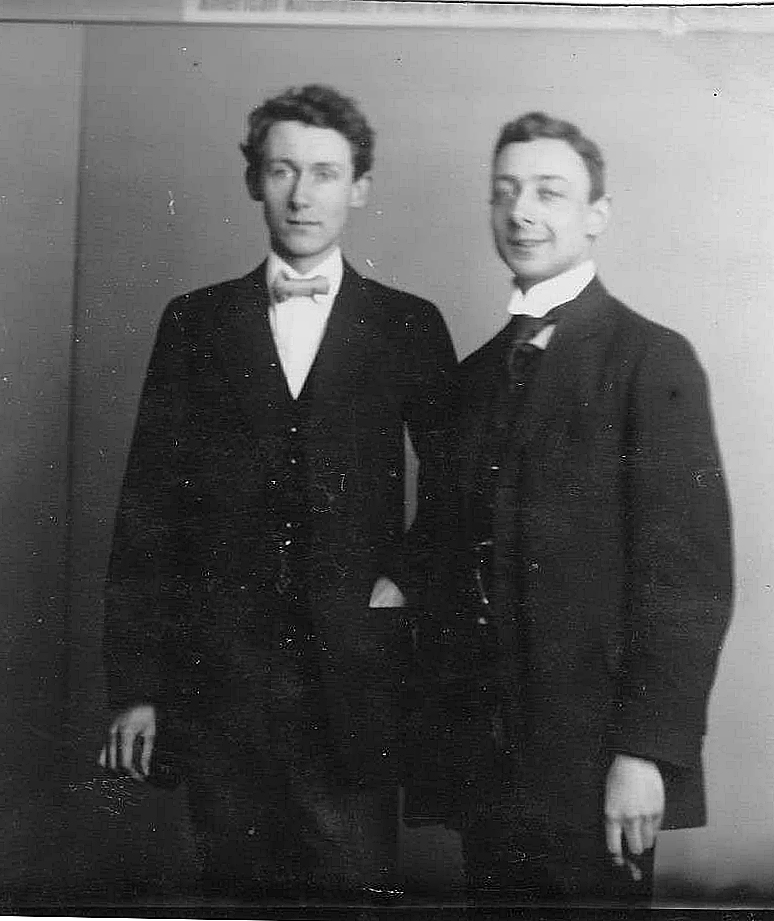 Jan Voerman Jr. staand links, tijdens een schildersklas Jan Voerman Jr, met broer Tijs in rok kostuum op weg naar een feest in Krasnapolsky tijdens hun studietijd in Amsterdam