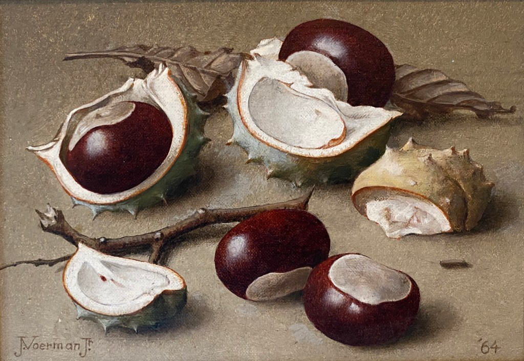 Het regent en het is mistig. Herfst! Maar er zijn kastanjes en paddenstoelen en dat maakt bijna alles goed. Ik kan geen kastanje voorbij lopen zonder er uitgebreid naar te kijken. De mooiste neem ik mee maar helaas worden ze binnen op een schaal al snel dof. In de herfst van 1963 zocht ik kastanjes met mijn opa Jan Voerman Jr. Ook hij had oog voor de mooie dingen in de natuur. Maar hij kon ze ook vastleggen. Zijn kastanjes bleven voor altijd glimmen. Op mijn 5e verjaardag kreeg ik een schilderij met de kastanjes die we toen vonden. Ik zoek nu ook kastanjes met mijn kleinkinderen. Jammer genoeg kan ik ze alleen maar bewaren op een foto. Volgend jaar maak ik kastanje en eikelmannetjes.