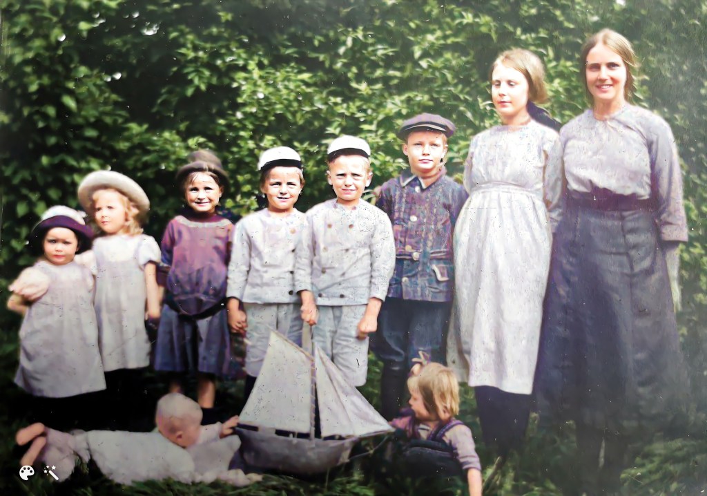 De kleinkinderen op bezoek in de Westpolder circa 1912. Oudste kleinkind is mijn oma Hetty Mansholt (1898) en staat geheel rechts.