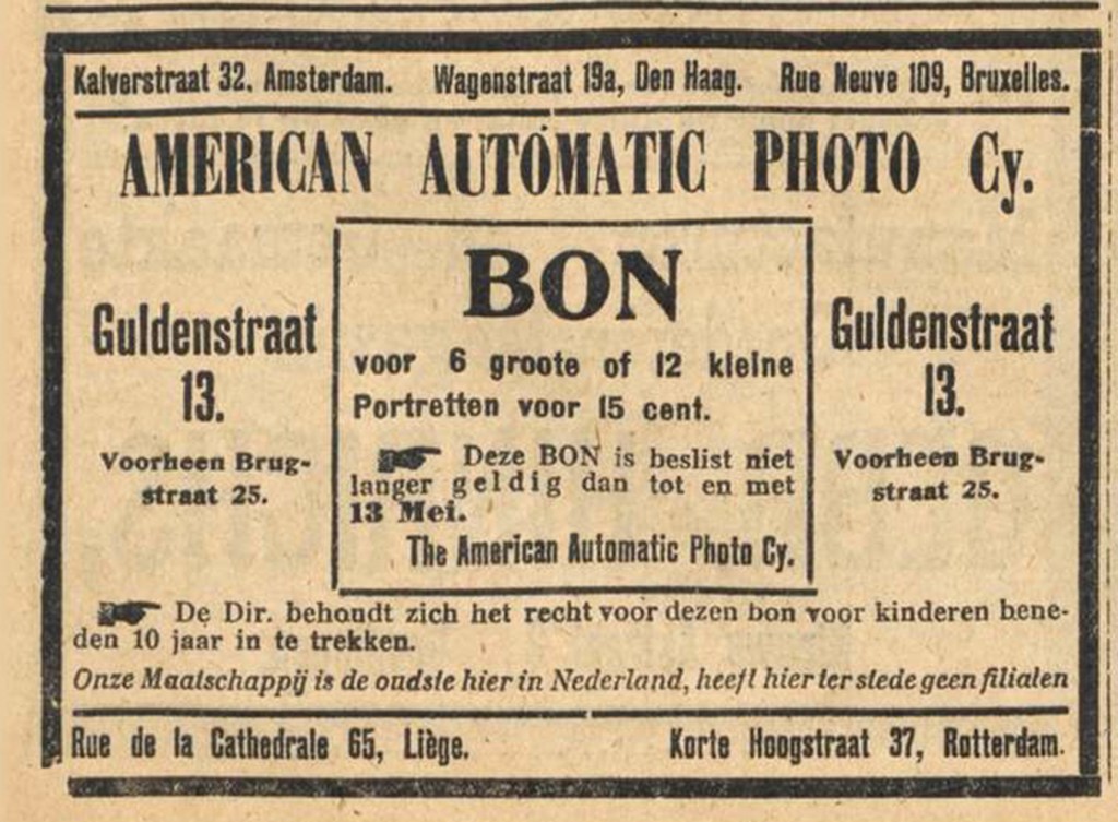 Al vlak na de eeuwwisseling kon je een soort pasfoto’s laten maken. Veel goedkoper dan bij een professionele fotograaf. Voor zo’n 15 cent kreeg je 6 grote of 12 kleine pasfoto’s. In Groningen was American Automatic Photo Cy gevestigd in de Brugstraat en later Guldenstraat 13. In het Mansholt archief kwam ik onderstaande foto’s tegen: