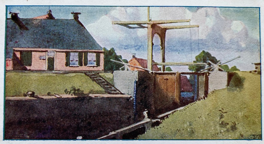Op zijn donkere krullebol droeg hij een pet, met voorop het jaarinsigne van de A.N.W.B. Zo fietste een echte fietser, die trots was op zijn ‘Wieler Bond’. Op de plaatsen waarvoor hij een opdracht had, werd gefotografeerd en geschetst. Hij kon een eind komen met de trein en bleef ook vaak overnachten in een plaatselijk hotel. Door de technische hulp van de foto’s kon hij, in Hattem teruggekomen, de plaatjes maken met een zekere exactheid. En toch bleven ze kleurig en gevoelig het beeld weergeven, dat hij gezien had. Tacozijl, Lemmer, Plaatje 11: Sondeler Leijen in Friesland lijkt helemaal een impressie van het IJssellandschap, zoals hij thuis had leren zien. Kampen, de geboortestad van zijn vader kreeg zes pittige afbeeldingen…
